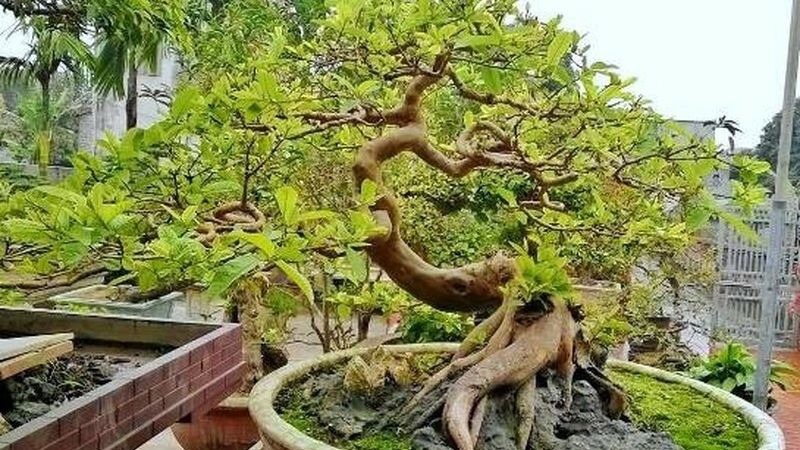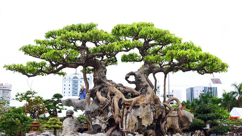 Cây có tán lá xanh rộng và một phần rễ nổi trên mặt đất, tạo nên hình dáng đẹp và mang tính thẩm mỹ cao.