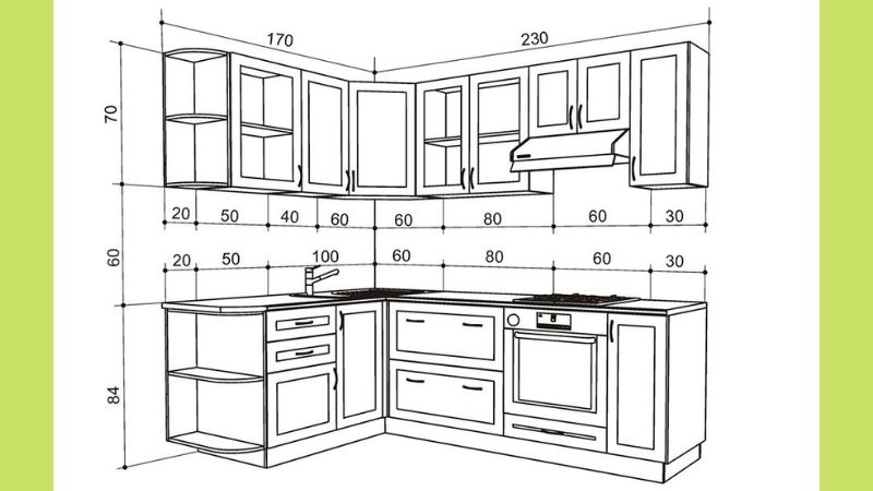 Tủ bếp kiểu chữ L thường bao gồm tủ bếp trên và dưới với các kích thước tiêu chuẩn mà bạn nên cân nhắc áp dụng, bao gồm: