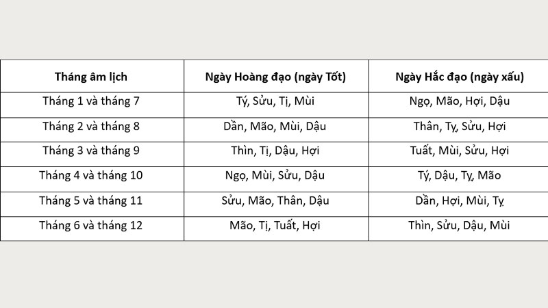 Cách tính ngày Hoàng đạo và Hắc đạo trong tháng âm lịch như sau:
